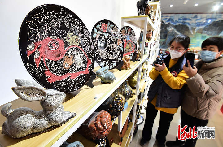 2023年1月10日,在河北省邯鄲市峰峰礦區(qū)一家陶瓷企業(yè)的展廳,顧客在參觀兔年主題陶瓷產(chǎn)品。