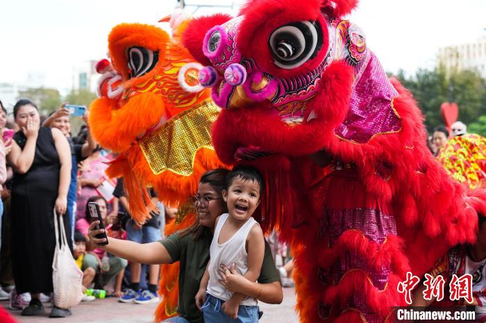 圖為舞獅表演吸引民眾合影。張興龍攝