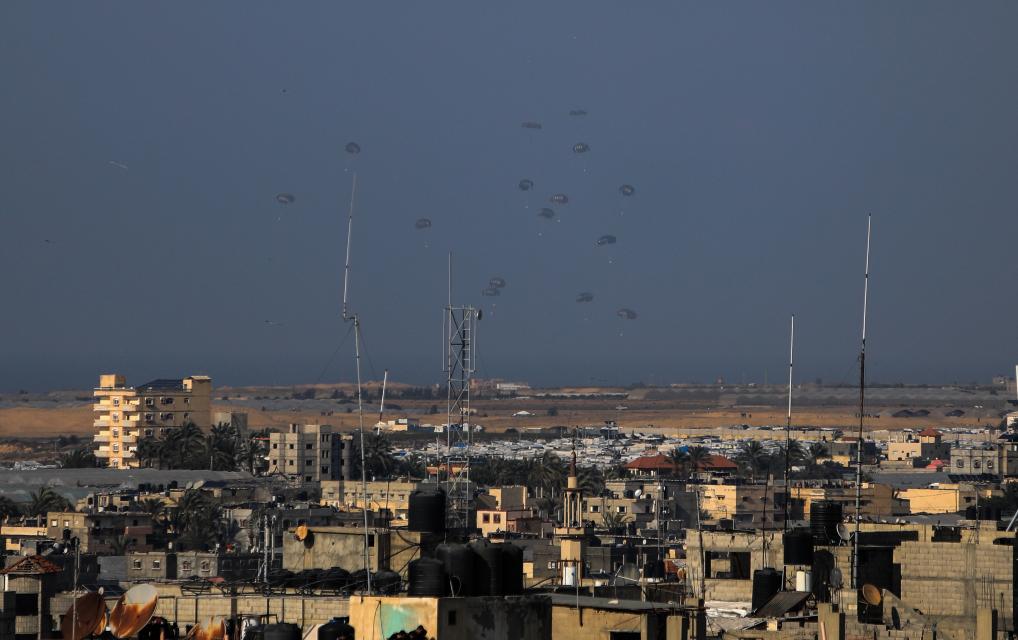 這是2月27日拍攝的向加沙地帶空投的救援物資。約旦武裝部隊27日發(fā)表聲明說,約旦皇家空軍當(dāng)天向巴勒斯坦加沙地帶空投了一批救援物資。聲明說,3架約旦皇家空軍的飛機和3架分別來自阿拉伯聯(lián)合酋長國、埃及和法國的飛機當(dāng)天從位于約旦首都安曼的阿卜杜拉二世空軍基地起飛,執(zhí)行向加沙地帶空投救援物資和食品的任務(wù)。新華社發(fā)(亞西爾·庫迪攝)