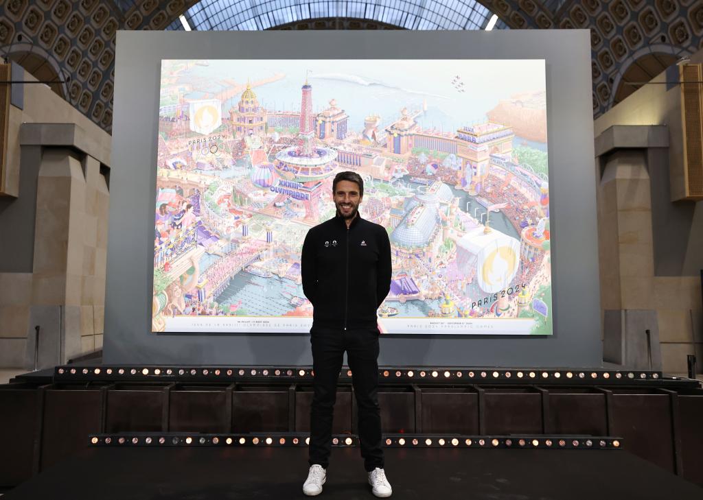 3月4日,在法國巴黎奧賽博物館舉行的巴黎奧運(yùn)會(huì)和殘奧會(huì)官方海報(bào)發(fā)布儀式上,巴黎奧組委主席托尼·埃斯坦蓋在海報(bào)前拍照。新華社記者 高靜 攝