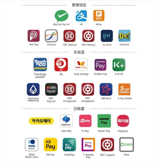 此外,部分境外電子錢包,可在境內(nèi)商戶通暢支付。以下境外電子錢包的用戶,可直接使用現(xiàn)有錢包進(jìn)行支付,無需另外下載其他App。