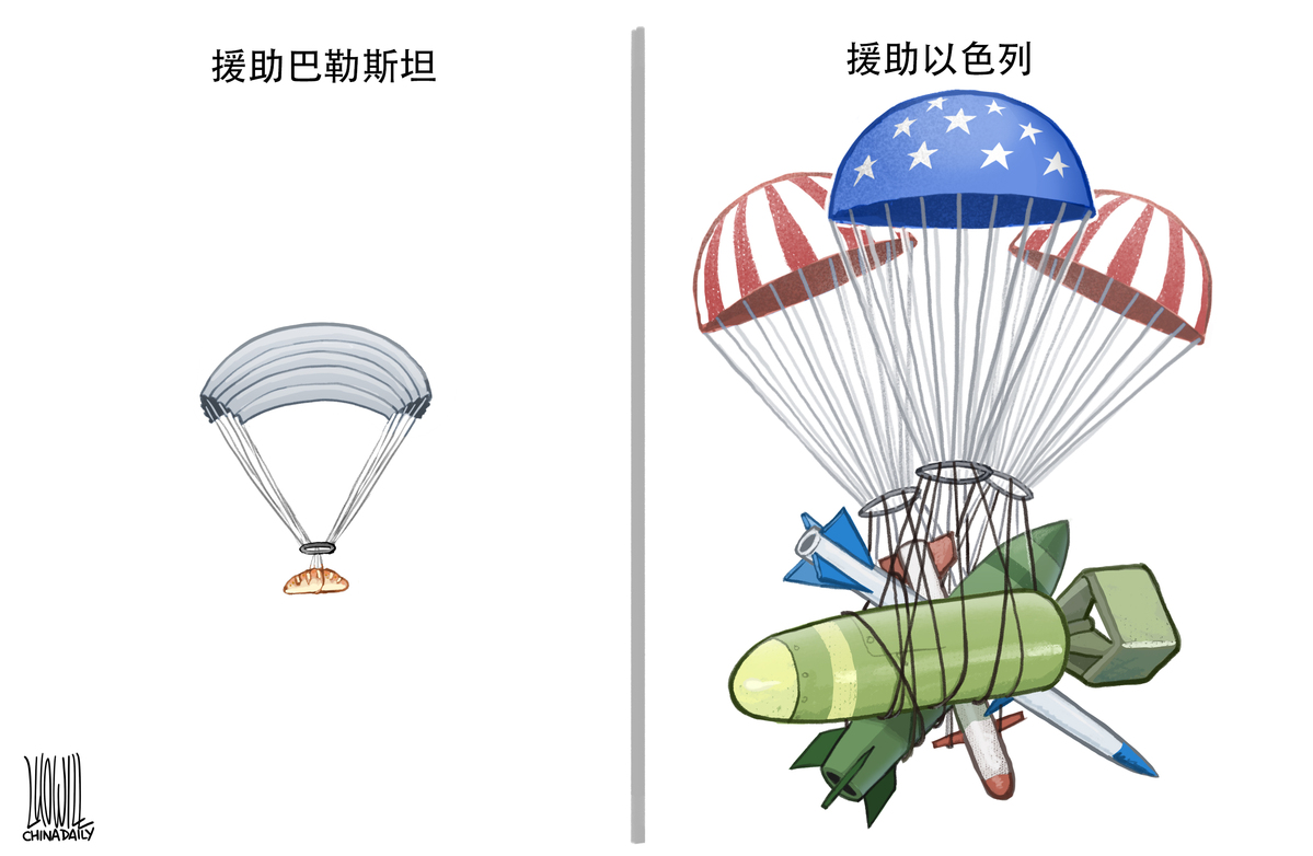 一邊給武器一邊發(fā)食物,美國表演荒謬。(來源:中國日報 羅杰 英文《中國日報》2024年3月13日8版)
