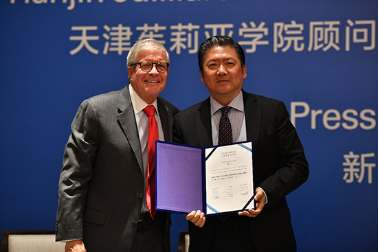 茱莉亞學(xué)院榮譽院長約瑟夫·W·波利希向天津茱莉亞顧問委員會主席余隆頒發(fā)聘書