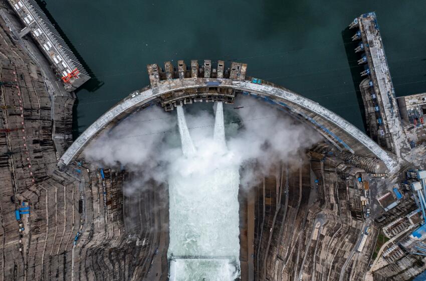 6月28日拍攝的正在發(fā)電運(yùn)行的白鶴灘水電站。