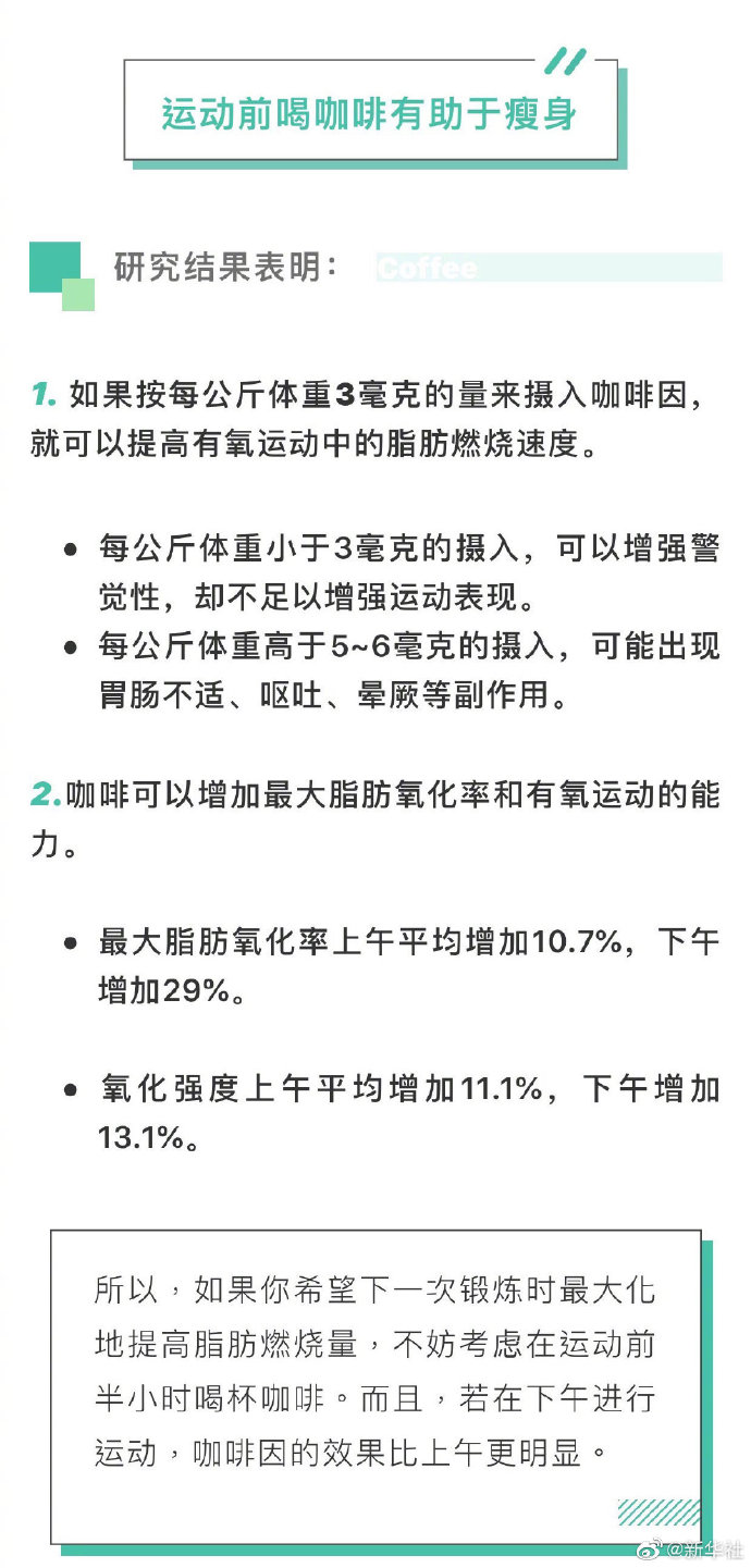 近日,發(fā)表在《國際運動營養(yǎng)學(xué)會雜志》的一項研究顯示,在進(jìn)行有氧運動前半小時攝入咖啡因(3毫克/公斤,相當(dāng)于一杯濃咖啡),能顯著提高脂肪燃燒的速度,尤其是在下午。戳圖告訴你怎么喝咖啡才能輔助燃脂。此外,研究稱喝咖啡預(yù)防多種癌癥。(生命時報)