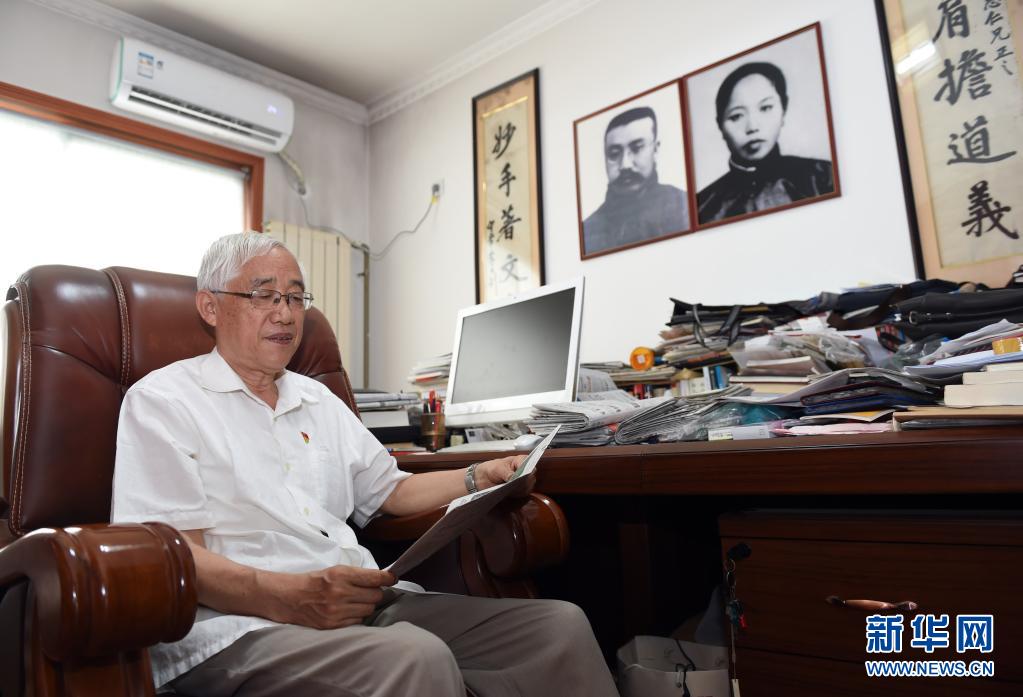 6月12日,李宏塔在家中書房讀書,墻上掛著祖父李大釗和祖母趙紉蘭的相片。新華社記者 周牧 攝