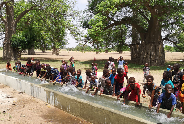 2019年7月15日,在塞內(nèi)加爾中部坦巴昆達(dá)大區(qū)一處村莊,當(dāng)?shù)卮迩f的兒童在剛剛建好并灌滿干凈井水的牲畜飲水槽戲水。