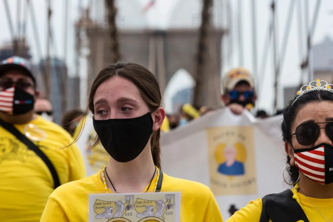 8月7日,游行者走過美國紐約布魯克林大橋,以紀(jì)念新冠逝者。新華社/美聯(lián)