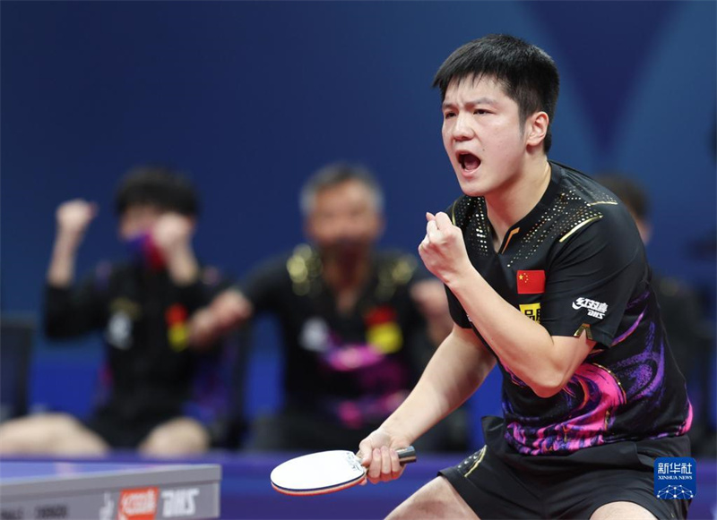 新華社成都10月9日電(記者陳地)當對手最后一擊回球下網(wǎng),王楚欽攥緊了拳頭,中國乒乓球男隊教練秦志戩和場下選手“噌”地站起身來,興奮地相互擊掌致意,王楚欽小跑過來加入其中,共同慶祝這一榮耀時刻。