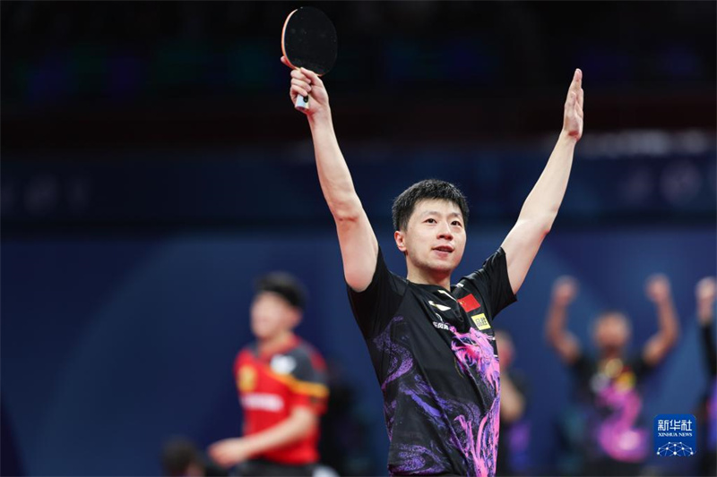 10月9日,中國隊選手馬龍在比賽中慶祝勝利,他以3比1戰(zhàn)勝德國隊選手邱黨。新華社記者 江宏景 攝