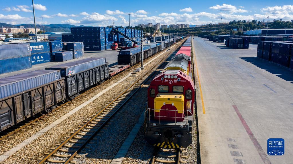 滿載30個(gè)標(biāo)準(zhǔn)集裝箱的中老鐵路新年首趟國際貨物列車?吭谥需F聯(lián)集昆明中心站(2022年1月1日攝,無人機(jī)照片)。新華社記者 胡超 攝