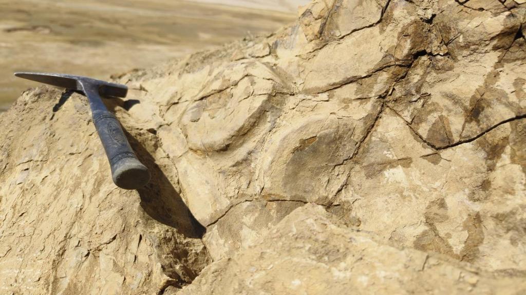 西藏定日地區(qū)三疊紀曲龍共巴組巖層中的魚龍化石錐體(圓盤狀物體)和肋骨。(中國科學院古脊椎動物與古人類研究所供圖)