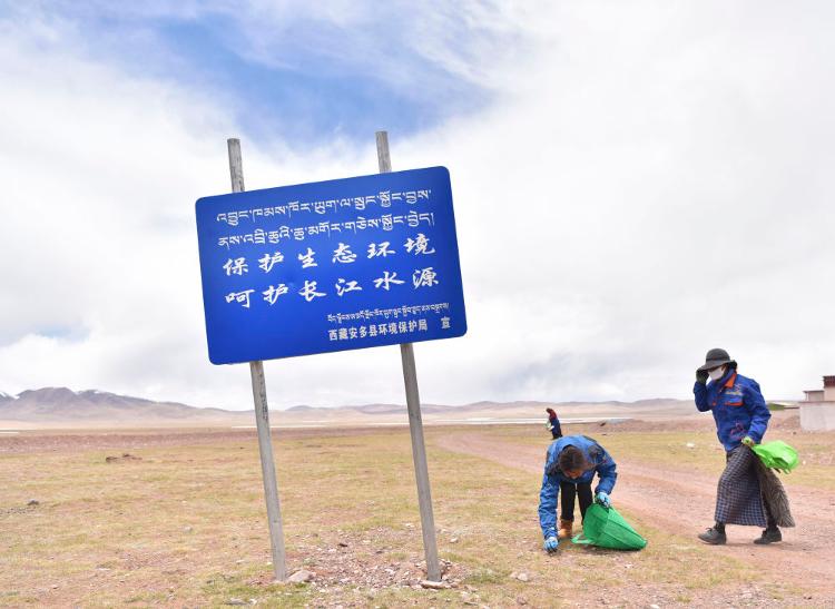 2019年5月28日,瑪曲鄉(xiāng)村民在撿拾垃圾。為保護(hù)長江源生態(tài)環(huán)境,西藏安多縣瑪曲鄉(xiāng)每周都會在全鄉(xiāng)范圍內(nèi)組織“保護(hù)長江源”撿拾垃圾活動,由各村黨員志愿者帶頭,生態(tài)巡護(hù)員參與,群眾自愿參加。