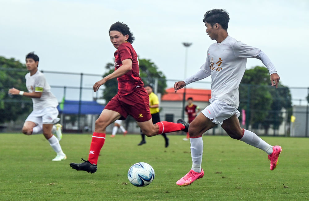 2023年11月8日,在第一屆學(xué)生(青年)運(yùn)動(dòng)會(huì)足球項(xiàng)目大學(xué)男子組小組賽第二輪比賽中,北京隊(duì)以2:0戰(zhàn)勝重慶隊(duì)。圖為北京隊(duì)球員錢誠(chéng)(右)在比賽中帶球突破。新華社記者 張愛(ài)林 攝