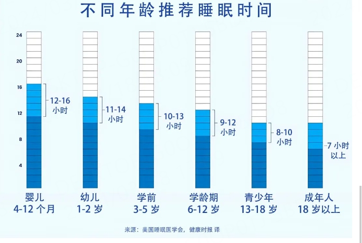 余周偉醫(yī)生2023年在科普中國刊文介紹,人一天到底睡多久最好呢?這個問題因人而異。為了弄清“人類睡眠時間”的問題,《美國睡眠醫(yī)學會》曾經(jīng)專門組織了一個睡眠專家小組回顧了數(shù)百項關于睡眠時間和健康問題的高質(zhì)量研究,然后通過幾輪投票和討論,最終給不同年齡段所需睡眠時間劃了一個范圍。