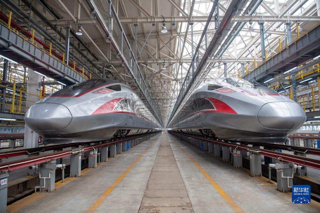 6月19日,鄭渝高鐵全線開通運(yùn)營(yíng)重慶首發(fā)列車CR400AF復(fù)興號(hào)動(dòng)車組(左)在重慶車輛段西動(dòng)車所亮相。新華社記者 唐奕 攝