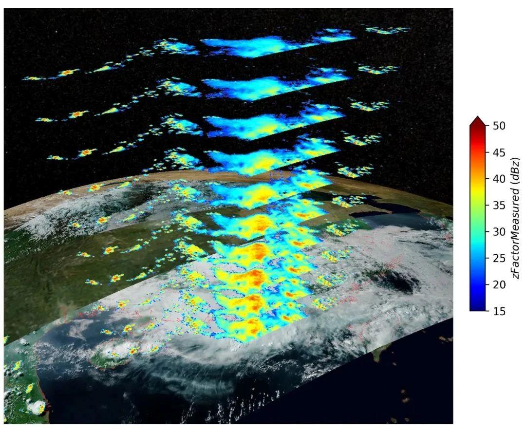△風云三號07星降水測量雷達捕捉到海南與廣東陽江附近降雨。圖中顯示的是從地表開始3.75公里到6公里的降水系統(tǒng)三維立體結(jié)構(gòu)