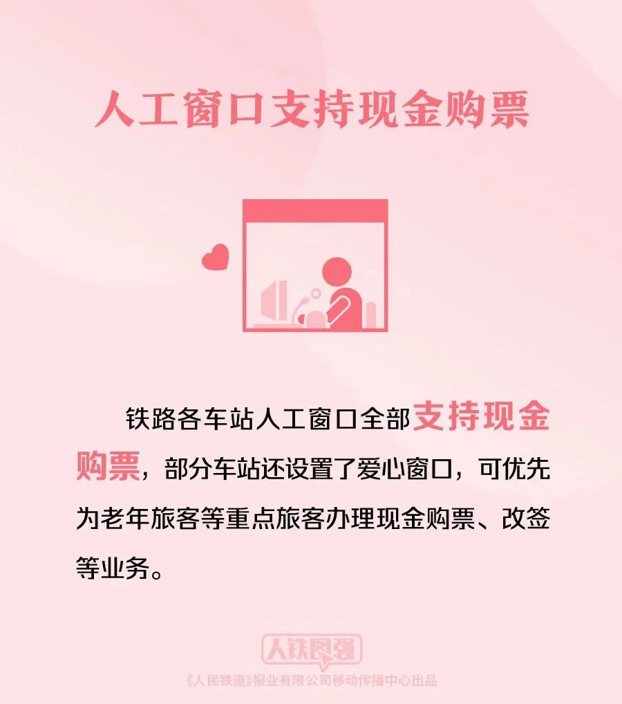 鐵路各車站人工窗口全部支持現(xiàn)金購(gòu)票,部分車站還設(shè)置了愛心窗口,可優(yōu)先為老年旅客等重點(diǎn)旅客辦理現(xiàn)金購(gòu)票、改簽等業(yè)務(wù)。