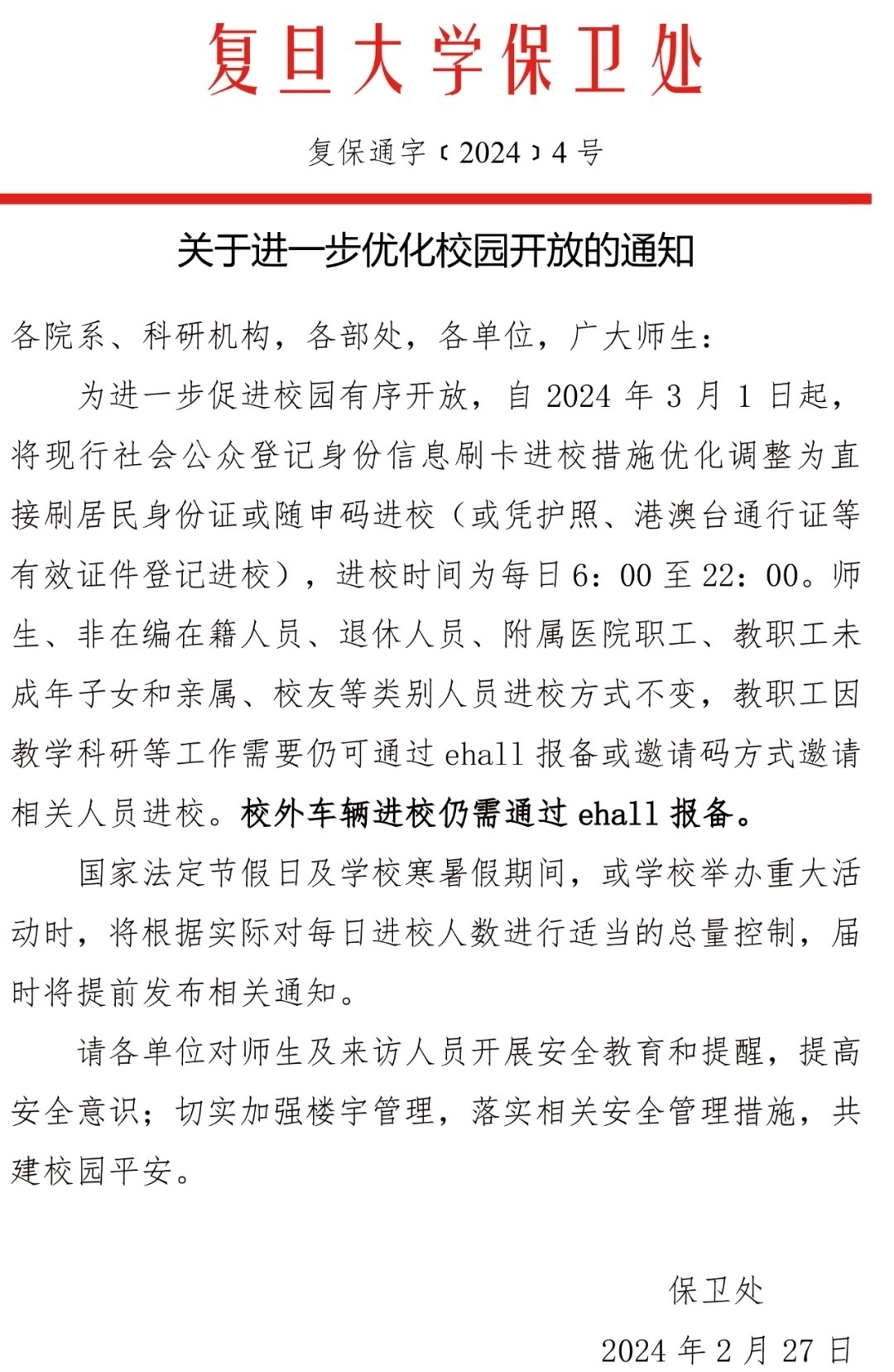 河北網(wǎng)訊  近日,據(jù)復(fù)旦大學(xué)保衛(wèi)處信息,自2024年3月1日起,現(xiàn)行的社會(huì)公眾登記身份信息刷卡進(jìn)校措施優(yōu)化調(diào)整為直接刷居民身份證或隨身碼進(jìn)校(或憑護(hù)照、港澳臺(tái)通行證等有效證件登記進(jìn)校),進(jìn)校時(shí)間為每天6:00-22:00。