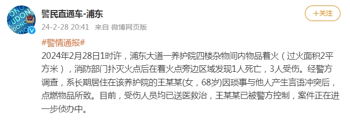 2024年2月28日1時許,浦東大道一養(yǎng)護院四樓雜物間內(nèi)物品著火(過火面積2平方米),消防部門撲滅火點后在著火點旁邊區(qū)域發(fā)現(xiàn)1人死亡,3人受傷。經(jīng)警方調(diào)查,系長期居住在該養(yǎng)護院的王某某(女,68歲)因瑣事與他人產(chǎn)生言語沖突后,點燃物品所致。目前,受傷人員均已送醫(yī)救治,王某某已被警方控制,案件正在進一步偵辦中。