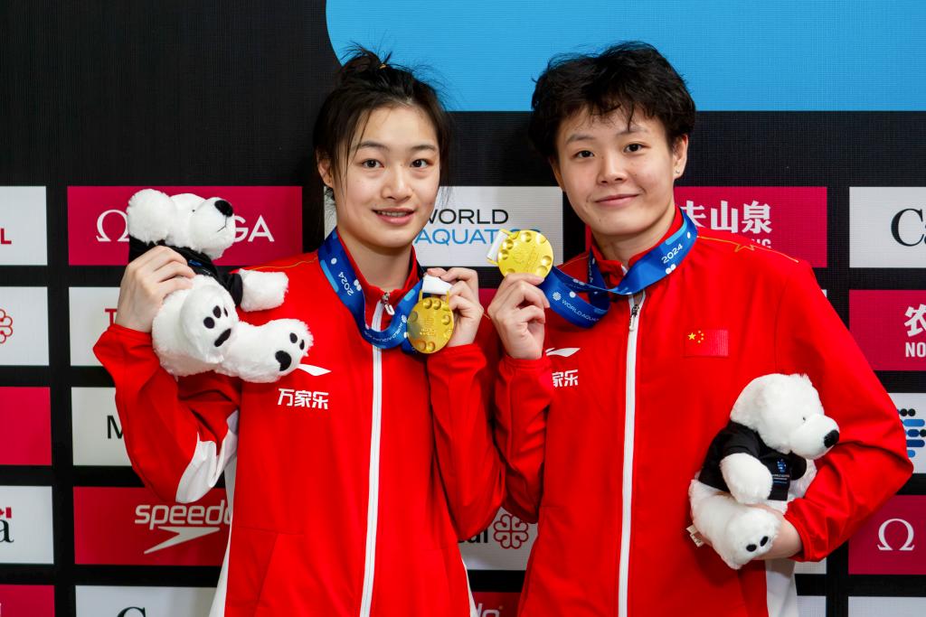 3月3日,中國選手昌雅妮(左)/陳藝文在女子雙人3米板頒獎儀式上。新華社發(fā)(劉佳歡攝)