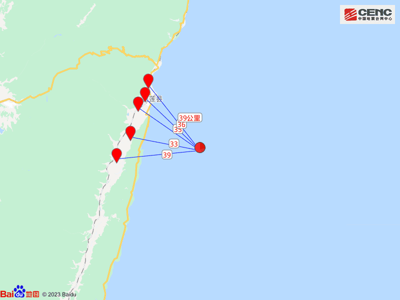 周邊縣城:震中距壽豐鄉(xiāng)33公里、距吉安鄉(xiāng)35公里、距花蓮市36公里、距鳳林鎮(zhèn)39公里、距新城鄉(xiāng)39公里,距花蓮縣33公里,距臺北市143公里。