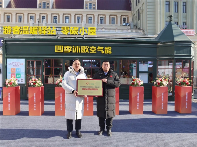 共青團(tuán)哈爾濱市委書記周成剛將“青年志愿者服務(wù)站”授予四季沐歌空氣能索菲亞教堂游客溫暖驛站·零碳小屋,此次授牌儀式意義非凡,它不僅標(biāo)志著四季沐歌空氣能溫暖驛站零碳小屋正式成為青年志愿者服務(wù)的重要陣地,更象征著共青團(tuán)哈爾濱市委與四季沐歌在公益領(lǐng)域深度攜手的創(chuàng)新實(shí)踐全面開啟。