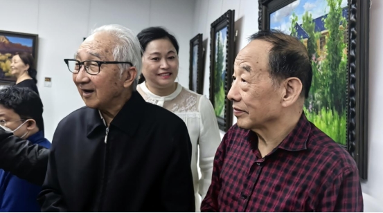 一進展廳,兩人便開始交流外光下油畫風景寫生的感悟與體會,交流都去過的江西婺源、新疆小分子村、晉西太行山等地的風土人情。藝術界泰斗靳尚誼來到開幕式現場時,韓玉臣與翟欣建馬上快步迎上,相互擁抱、親切問候。之后,便一同陪靳尚誼仔細觀看展覽作品。