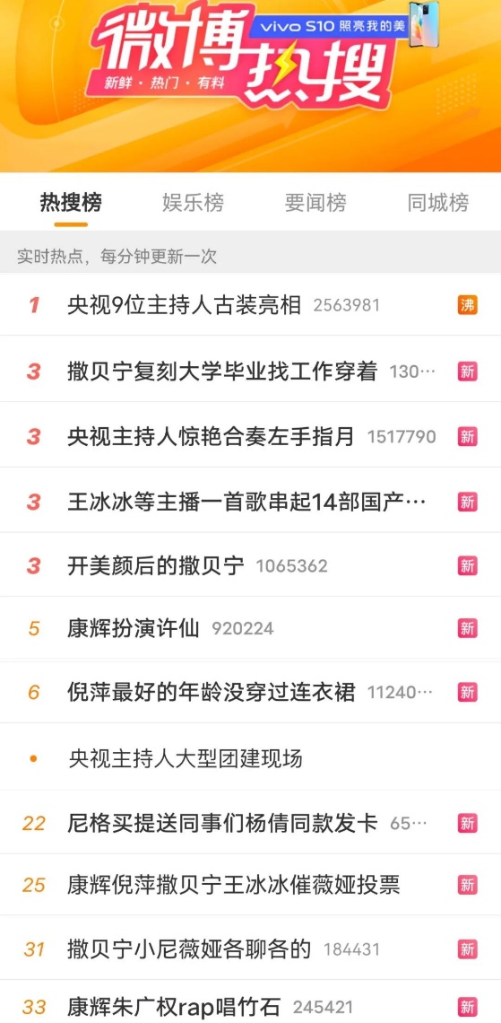 #央視9位主持人古裝亮相# #撒貝寧復(fù)刻大學(xué)畢業(yè)找工作穿著# #央視主持人驚艷合奏左手指月#等20余個話題拿下全網(wǎng)熱搜,相關(guān)話題總閱讀量20億+。