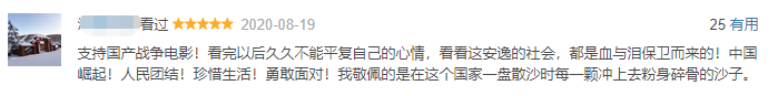 《八佰》成為爆款,一個(gè)重要的原因是它抓住了中國(guó)人的家國(guó)情懷和抗?fàn)幰庾R(shí),凝聚了中國(guó)軍民齊心抵抗外辱的共同情緒。正因?yàn)橛袩o數(shù)八佰壯士一樣的英雄,中華民族才得以最終贏得抗戰(zhàn)勝利。觀眾為80年前以命護(hù)國(guó)的平民英雄落淚,實(shí)質(zhì)是發(fā)自肺腑地敬仰抗戰(zhàn)英雄。